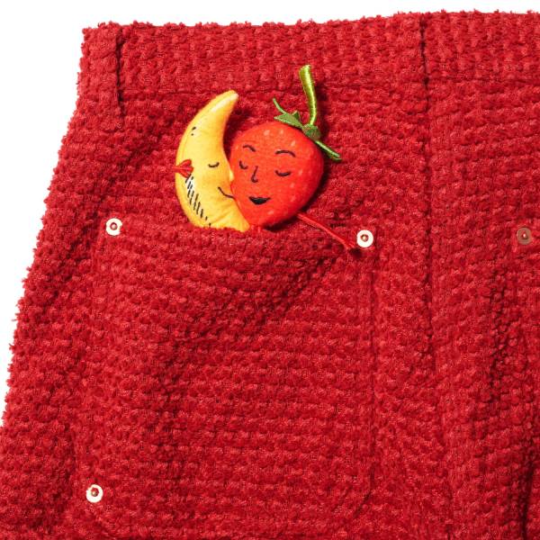 立体的ないちごと月のワッペンは、手刺繍と手芸で丁寧につくられたSKY HIGH FARM UNIVERSEの象徴です。