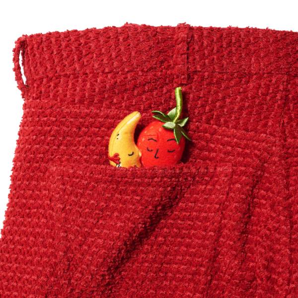 生地全体にパンチングと洗い加工を施し、いちごのつぶつぶ感を表現したコットン素材。