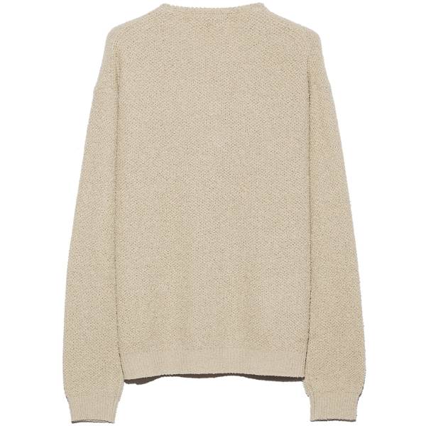 通常の自動編み機では編めない糸で、職人の手で動かす手横で、より凹凸感が出る「ハチ巣柄」で編んでいます。